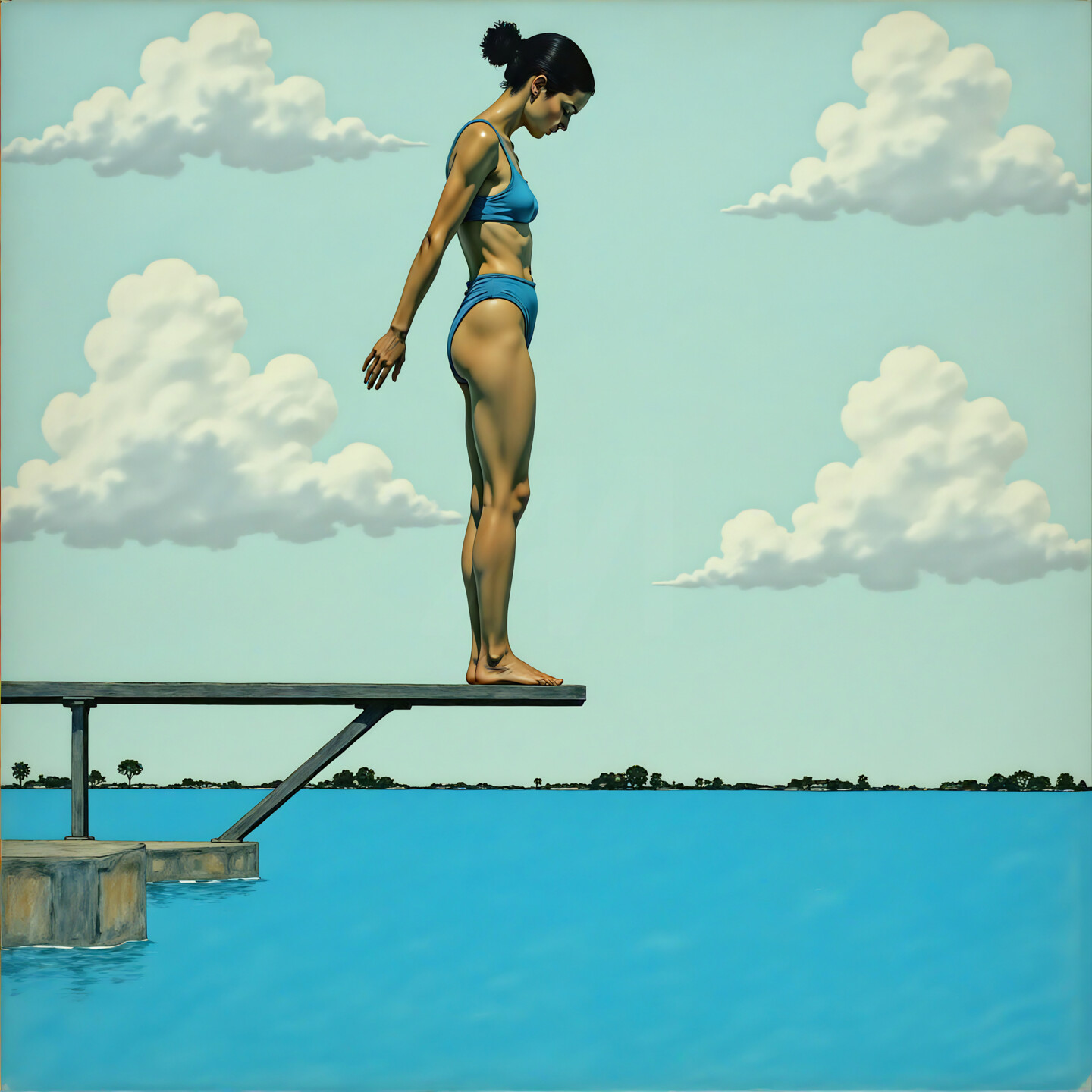 Standing poised at the edge of the board, the figure in "Concentration for Diving" embodies a serenity that precedes action. The painting captures the profound quiet of a moment suspended in time, where anticipation and preparation meld into a delicate equilibrium. The woman’s form, defined yet relaxed, mirrors the fluidity of the water below and the expansive calm of the sky above.