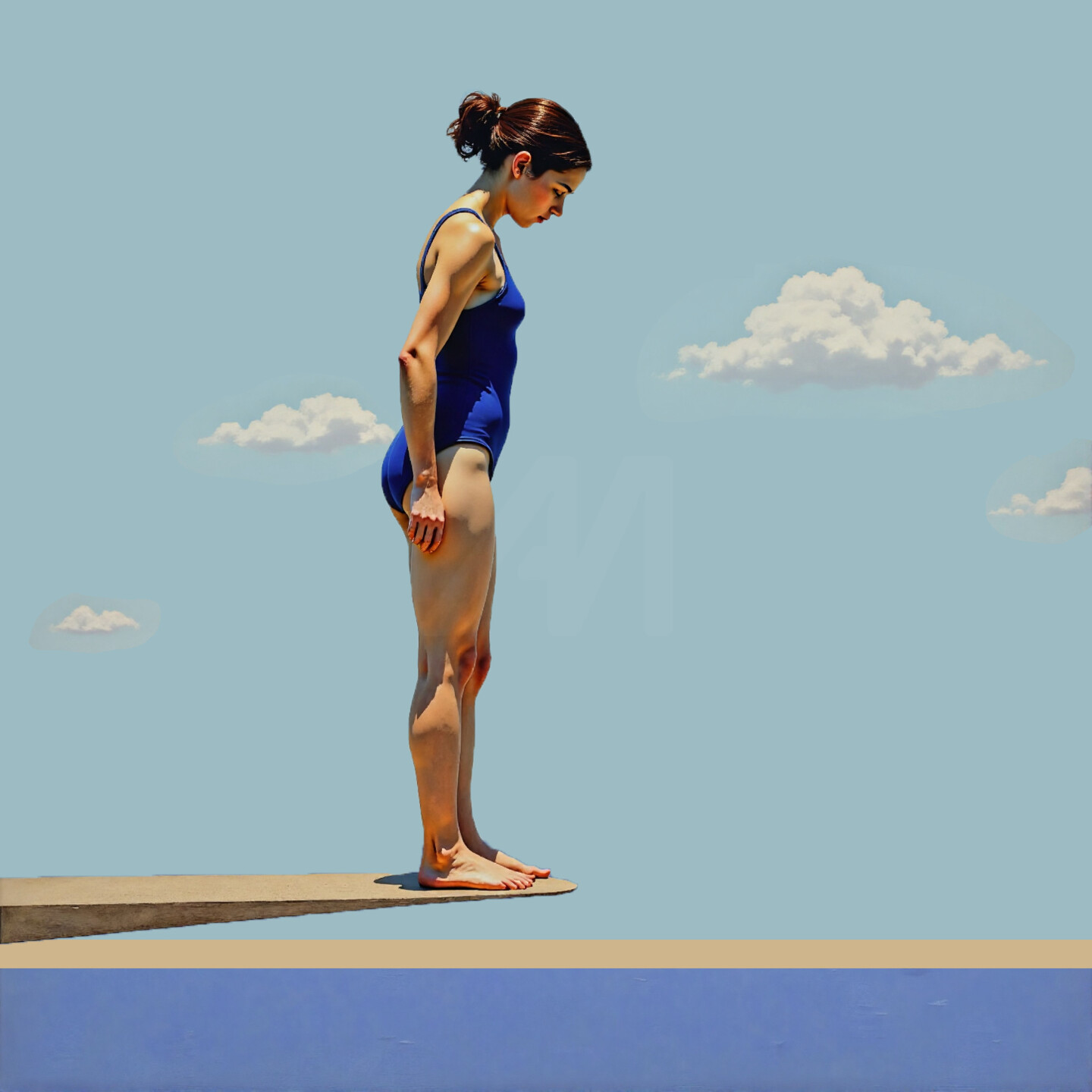 The blue-dominated palette evokes a calm exterior, much like the tranquil sky and water stretched out below. However, this outward serenity contrasts the charged anticipation in her stance. The horizontal alignment of the diving board juxtaposed with the verticality of the woman creates a composition of balance teetering on the edge of action, symbolic of the fragile equilibrium between doubt and courage.