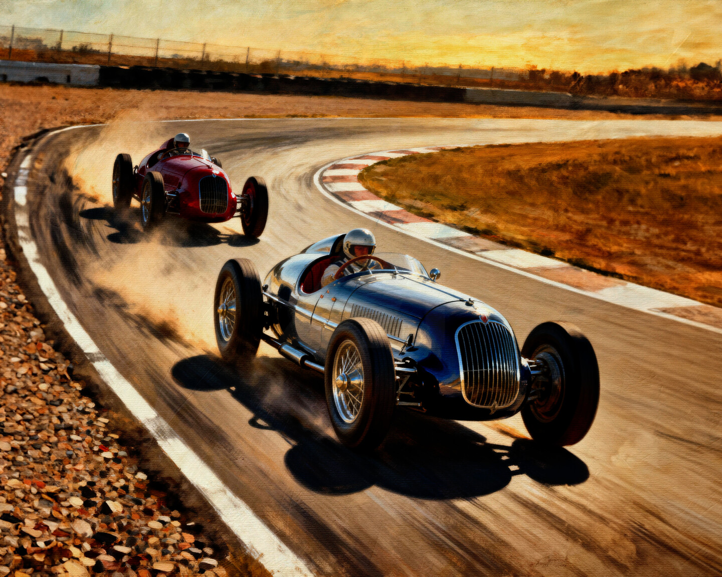 The artist’s brushstrokes bring the scene to life, from the textured gravel shoulder to the streaked pavement, evoking a sense of speed and motion. The dynamic composition draws the viewer’s eye along the curving track, framed by a dry, golden landscape and a glowing sunset sky. Every detail, from the drivers’ helmets to the dust trails, reflects the timeless allure of classic motorsport.