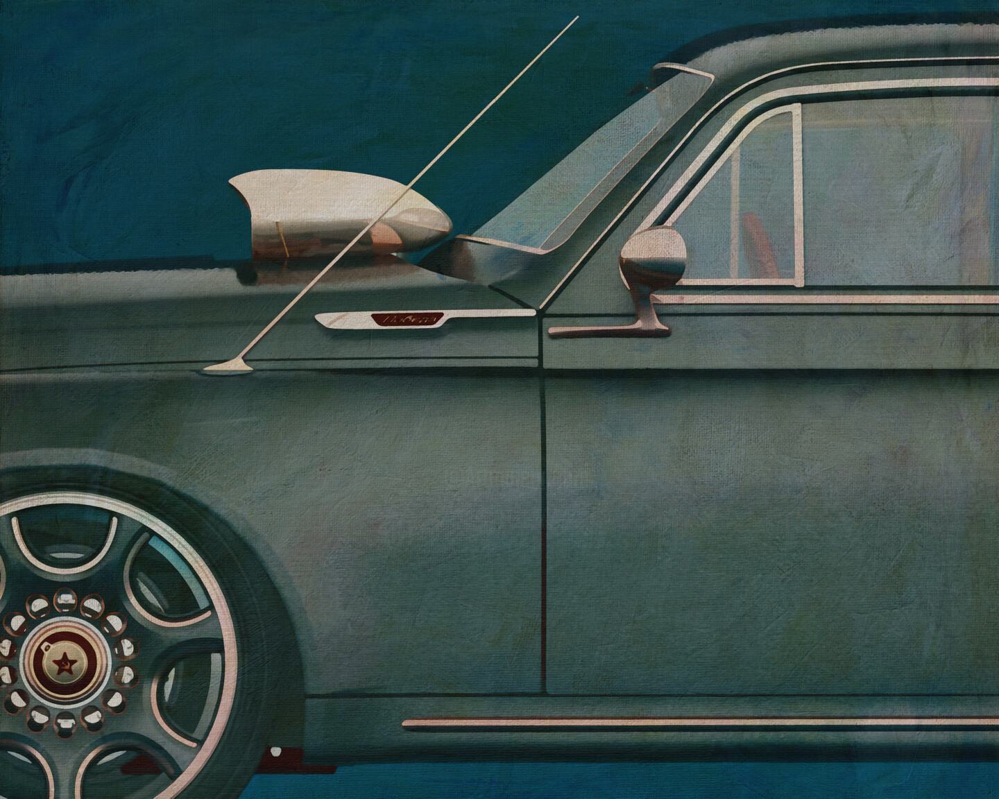 Jan Keteleer combines brilliant colours and presents a supernatural detail in this painting of a detail from the legendary GAZ M20V Black Beauty 1946. This is a piece that speaks to those who really love cars. –