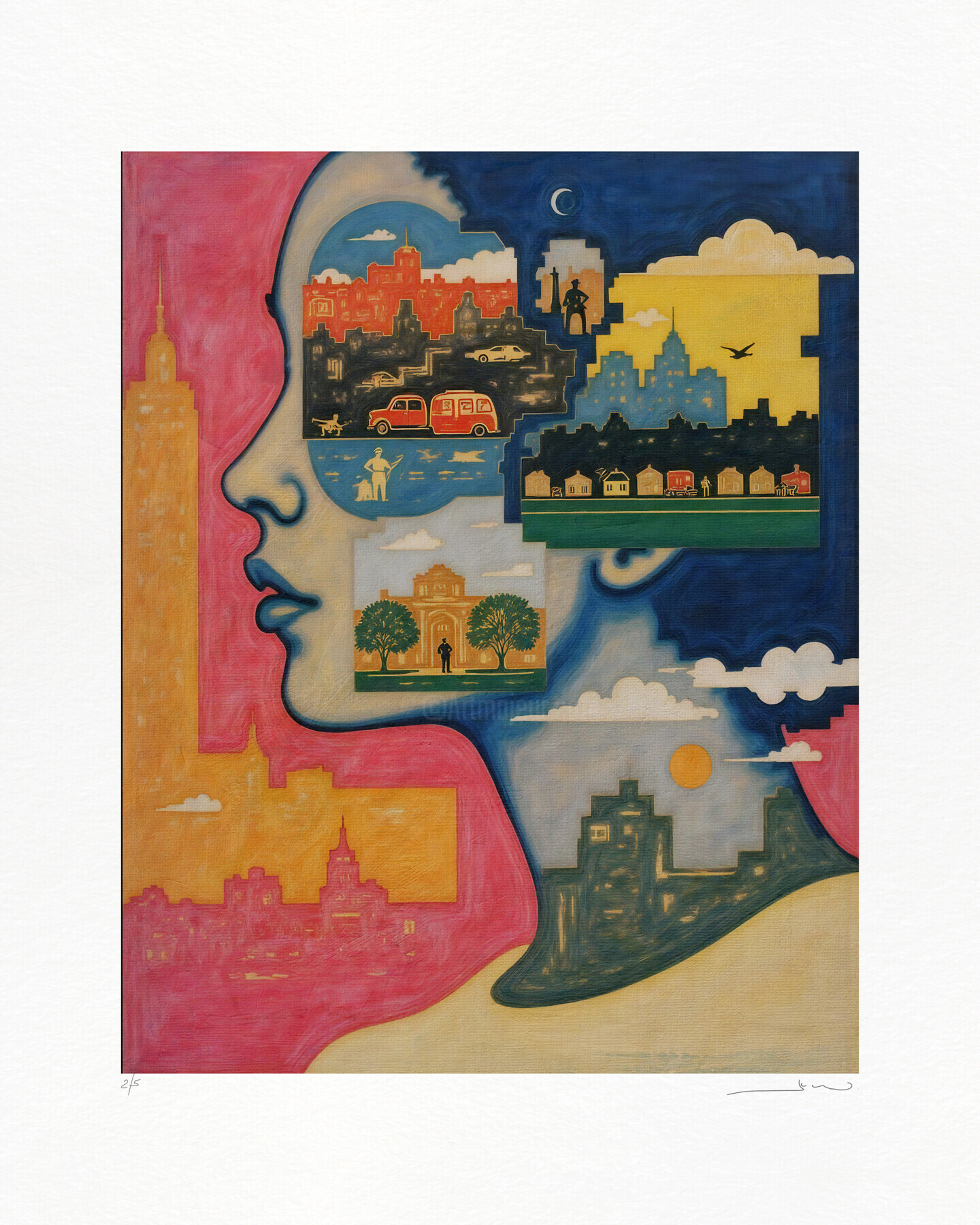 This collage is my take on what a tourist experience is like, combining discovery, wonder and connection. The outline of a woman's head acts as a familiar yet personal frame, filled with the detailed layers of a sprawling cityscape. Inside her profile, you can see all the urban elements that give the city its heartbeat – skyscrapers, busy streets and neon signs. It's almost like her very essence has been imprinted with the allure and dynamism of the city she moves through.