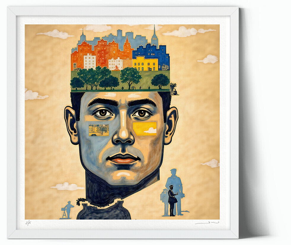 This collage came about because we were curious about the deep connection between ourselves and the places we live. Basically, it's a look at how our surroundings, especially cityscapes, influence who we are. The man's head, which is rooted in its raw, individual form, is crowned with an entire city, symbolising the weight of our experiences and the bustling world we carry with us.